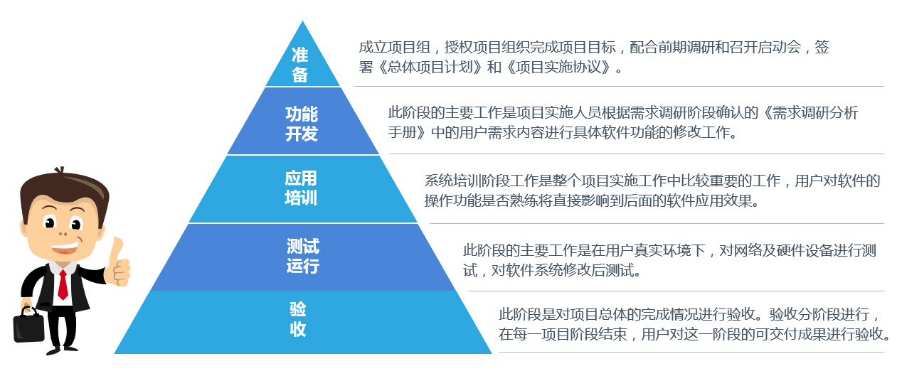 l 准备:成立项目组,授权项目组织完成项目目标,配合前期调研和召开启动会,签署《总体项目计划》和《项目实施协议》 l 功能开发:此阶段的主要工作是项目实施人员根据需求调研阶段确认的《需求调研分析手册》中的用户需求内容进行具体软件功能的修改工作 l 应用培训:系统培训阶段工作是整个项目实施工作中比较重要的工作,用户对软件的操作功能是否熟练将直接影响到后面的软件应用效果 l 测试运行:此阶段的主要工作是在用户真实环境下,对网络及硬件设备进行测试,对软件系统修改后测试 l 验收:此阶段是对项目总体的完成情况进行验收。验收分阶段进行,在每一项目阶段结束,用户对这一阶段的可交付成果进行验收